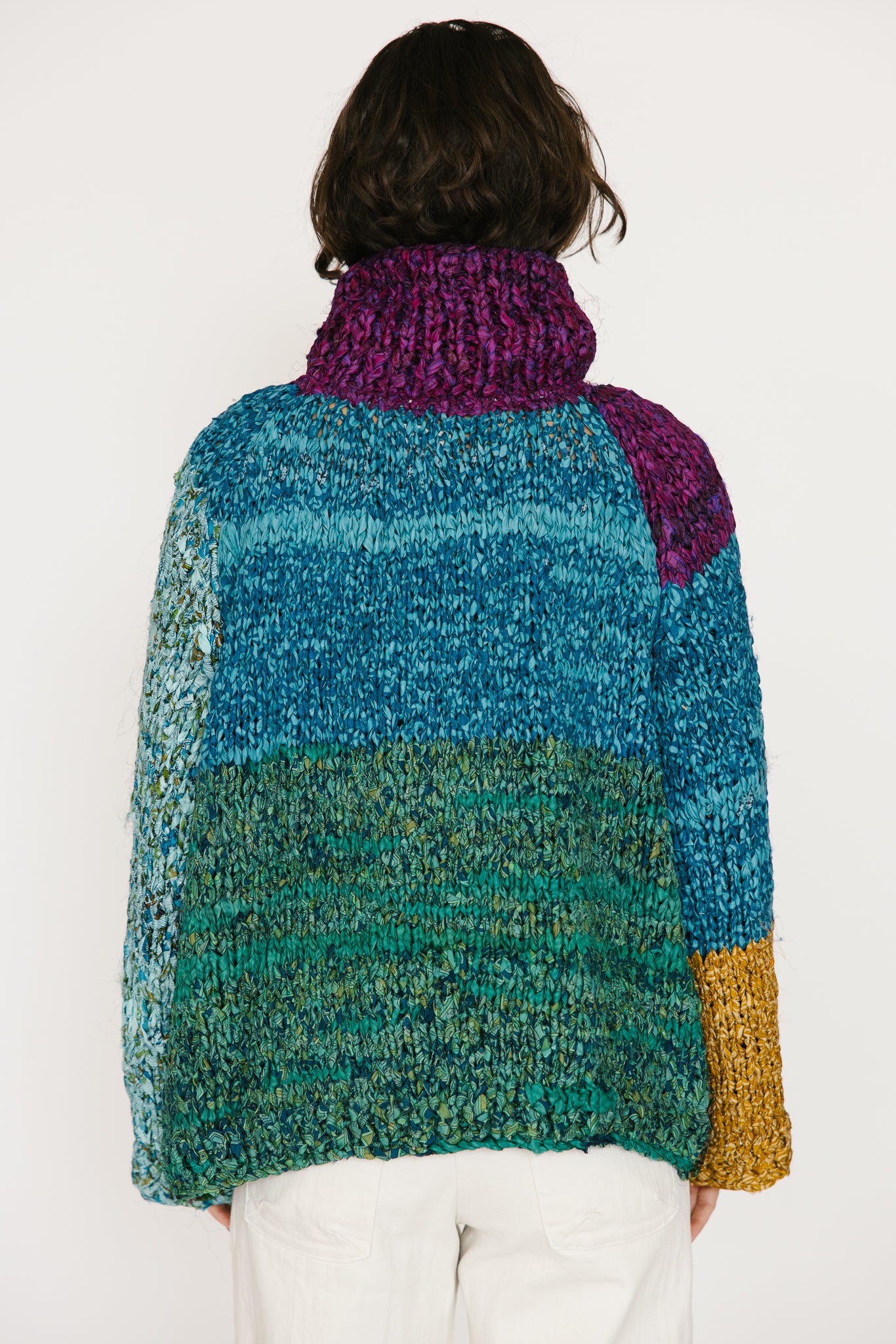 About the Textiles Used: The Vishnu Roll-Neck Sweater has been knitted out of strips of recycled sari silk. It takes six sarees to make up one sweater. The recycled silk is torn into strips and hand knitted. Each one is completely handcrafted and no two are alike. The silk knit has a fairly lightweight feel, and will naturally fray and stretch a little as worn.