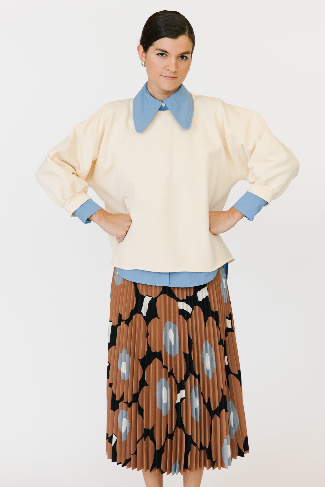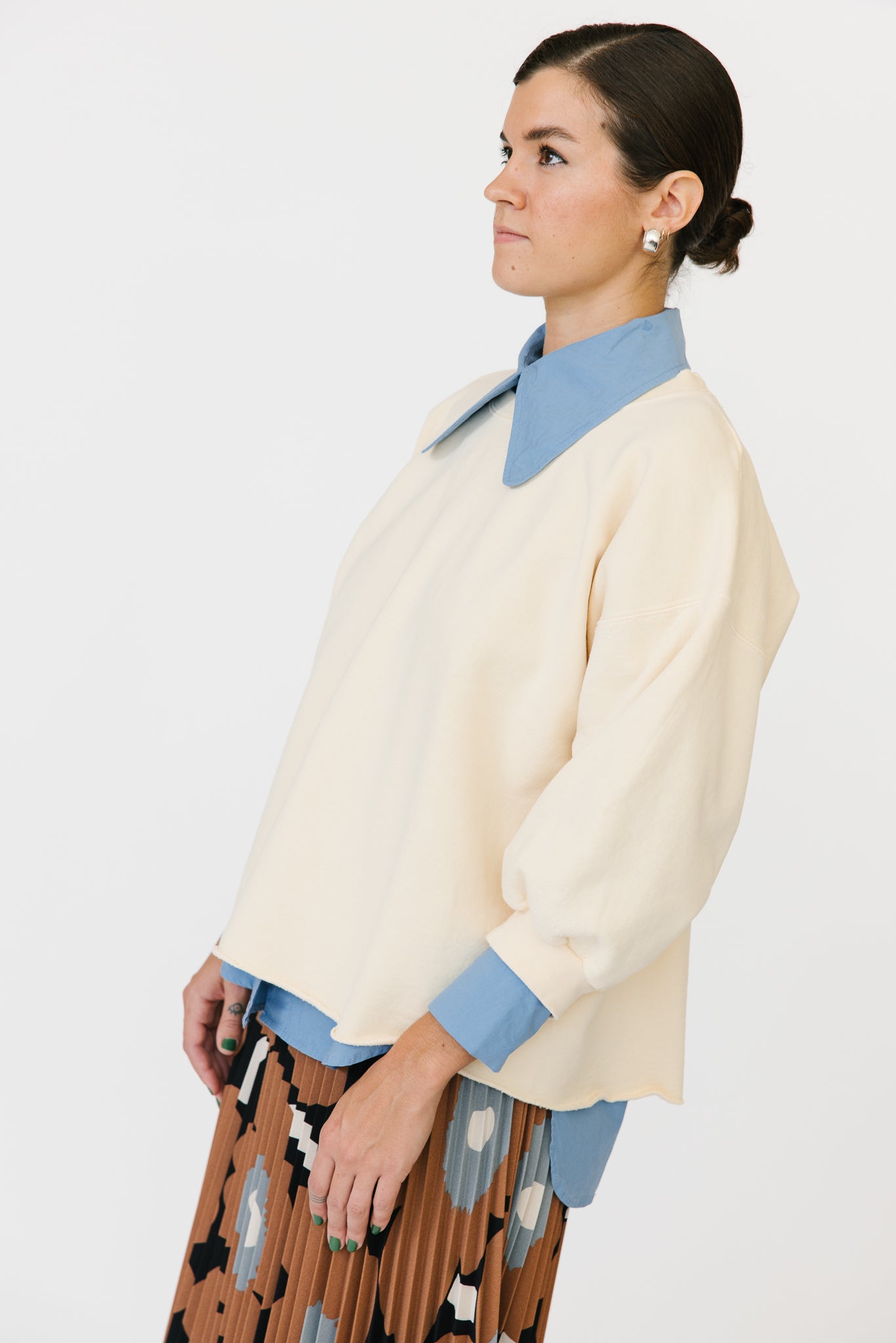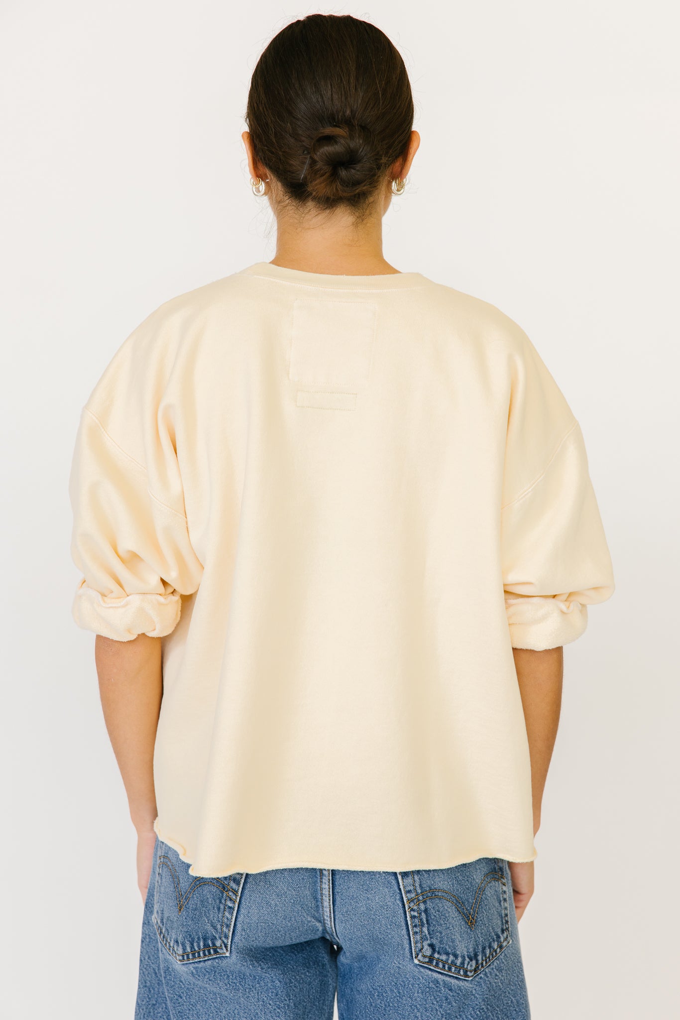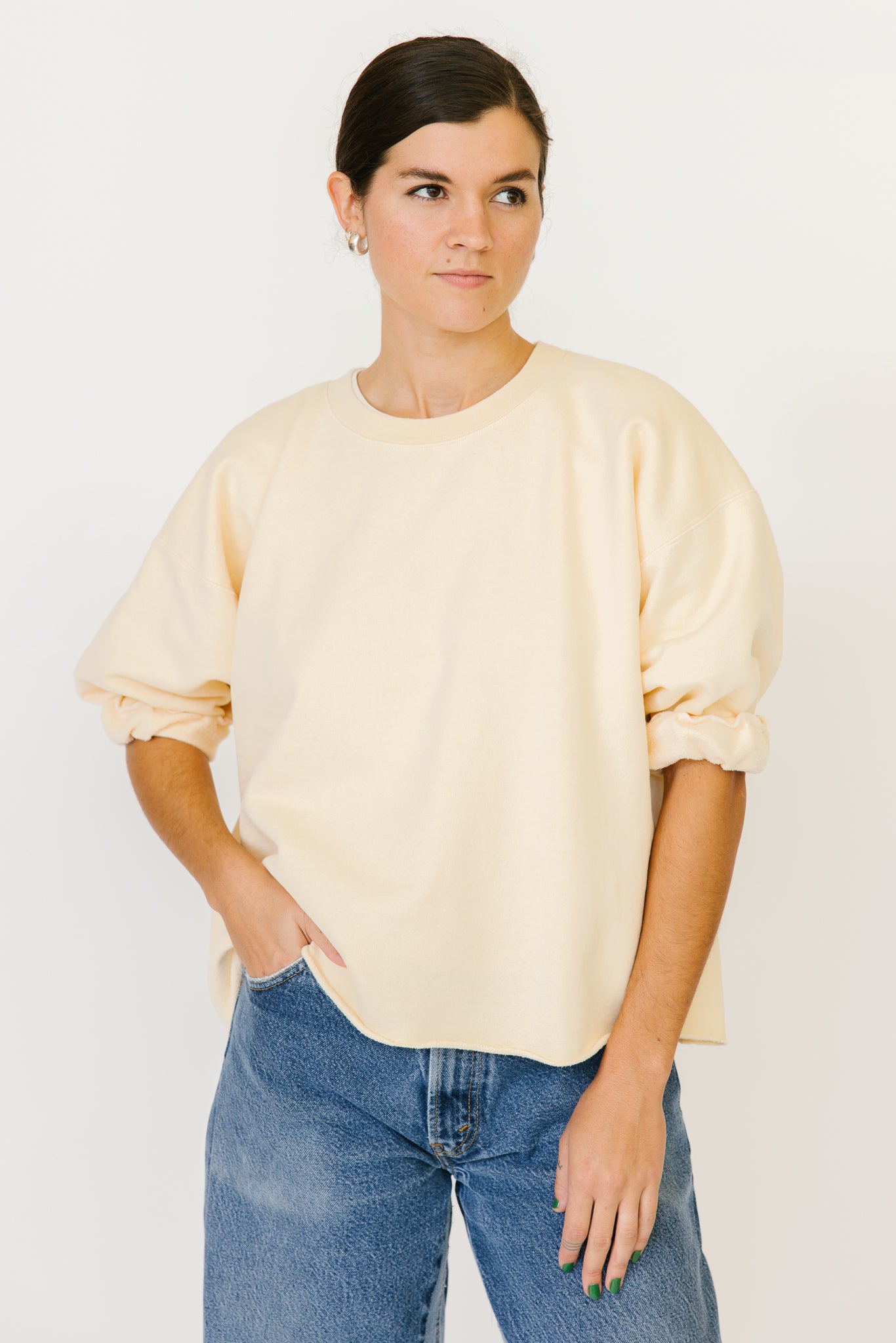 Rachel Comey's classic crewneck sweatshirt with drop shoulders, cropped sleeves, a raw edge hemline and unique distressing throughout. Now in new seasonal colors and classic hues. Makes a great styling piece for any look.